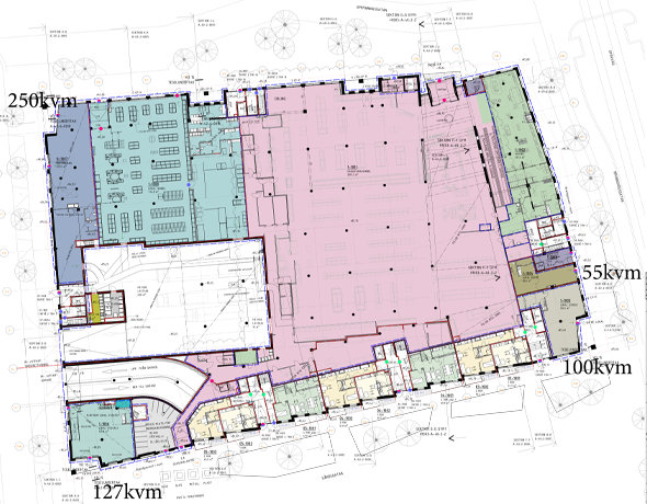 Ledig lokal om 250 kvm markerad i mörkblått.