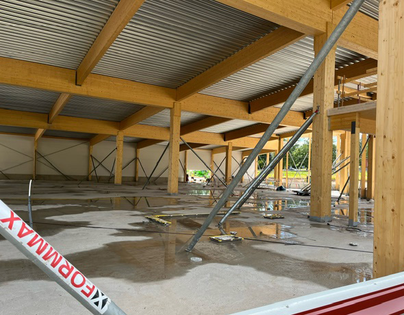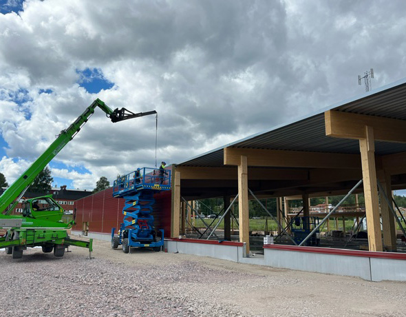 Betongplattan och lastkajen är helt färdigställda, även limträstommen har rest klart och har endast några kompletterande arbeten var på den självbärande takplåten. Betongsockel är monterad och färdig med endast fogning av vertikala skarvar kvar.