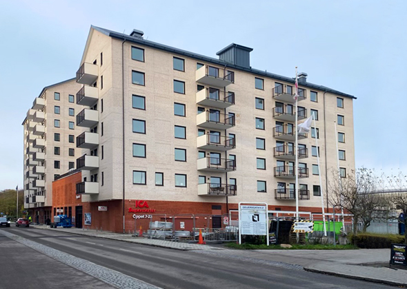 Projektet innehåller 6 972 kvm bostäder och cirka 2 000 kvm kommersiell verksamhet. De kommersiella verksamheterna är uppdelade på ICA-butiken samt två lokaler för restaurang och övrig service som alla ligger i gatuplan med egna entréer. Byggnaderna har två garageplan, ett under ICA-butiken där vi byggt ett underjordiskt kundparkeringsgarage på cirka 60 p-platser och ytterligare ett separat parkeringsplan för boende med cirka 50 p-platser, beläget ovanför butiken.