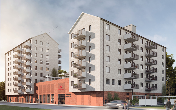 Ovan det kommersiella gatuplanet finns drygt 70 nya bostadsrätter som utvecklats av JM och möjliggjorts genom en tredimensionell fastighetsbildning.