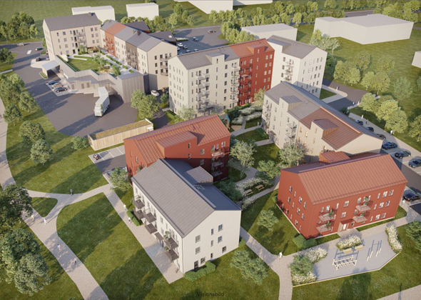 Vy från söder med båda bostadskvarteren synliga