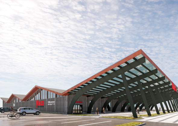 Visionsillustration av framtida ICA Maxi Gunnesbo. Wingårdhs arkitekter.